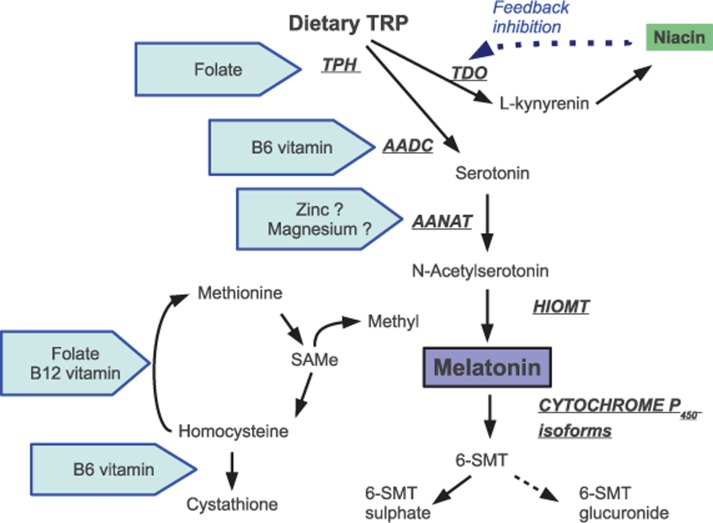 褪黑激素的合成會受到色胺酸、血清素、維他命B6、B12、葉酸、菸鹼酸等影響。下圖為褪黑激素之合成代謝途徑,以及某些營養素影響合成的可能部位。酵素以斜體下劃線大寫字母表示。 TRP,色氨酸; TPH,色氨酸羥化酶; TDO,色氨酸雙加氧酶; AADC,芳香族氨基酸脫羧酶; AANAT,芳基烷基胺-N-乙酰基轉移酶; HIOMT,羥基吲哚-O-甲基轉移酶;6-SMT,6-硫酸氧基褪黑激素; SAMe,S-腺苷甲硫氨酸。
